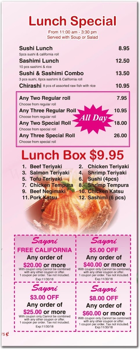 The Special Rolls are a highlight, with the Caterpillar Roll and Sayori Roll standing out as fan favorites. If you're in the mood for something adventurous, the Dancing Eel Roll and Mango Roll are excellent choices.